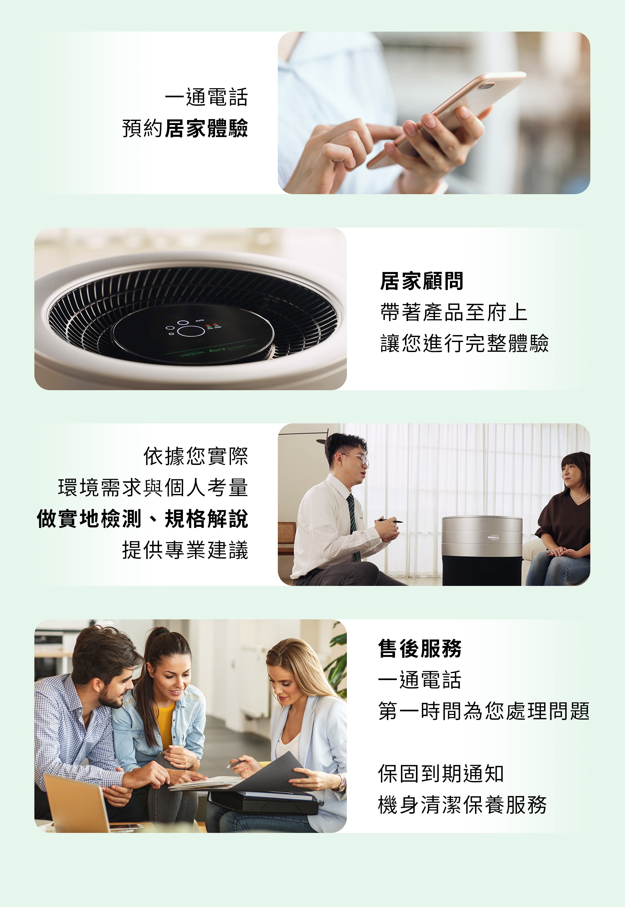 透過下方電話或網路預約,居家顧問會與您約合適的時間,帶著產品至您府上,讓您充分試用產品,並進行解說、數據檢測,親身體驗,眼見為憑!喜歡再下單!